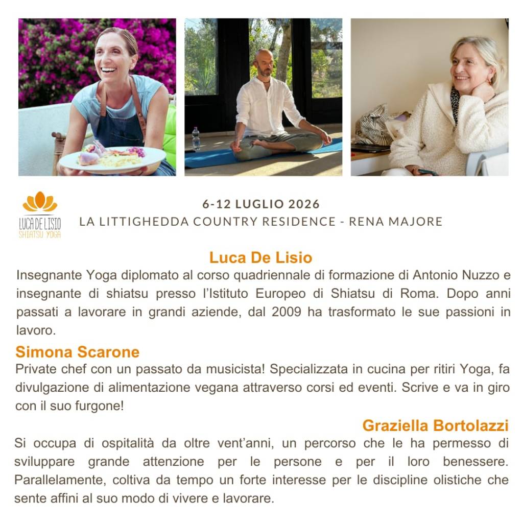 Oltre a cucinare per le stupende insegnanti di Yoga provenienti da tutta Europa (e anche da oltreoceano), sarà impegnata a cucinare per due Vacanze Yoga in Gallura con insegnanti italiani: